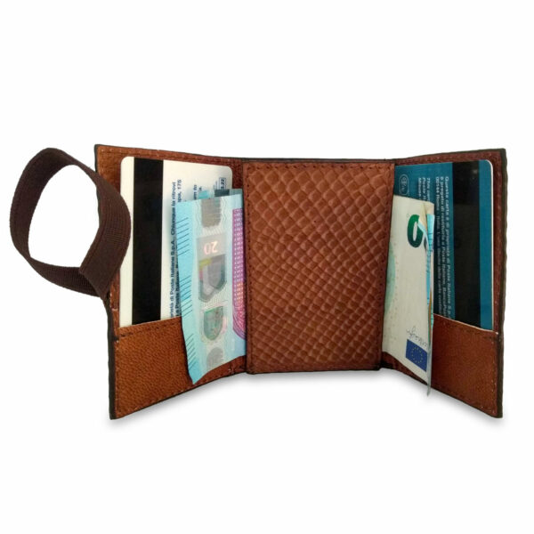 Porta tessere e ferma soldi in pelle nabuk marrone. Pratico, comodo ed intelligente. Come un piccolo portafogli, dal design nord europeo, consente di avere con sé tutto il necessario in un oggetto adatto per ogni tasca o pochette.
