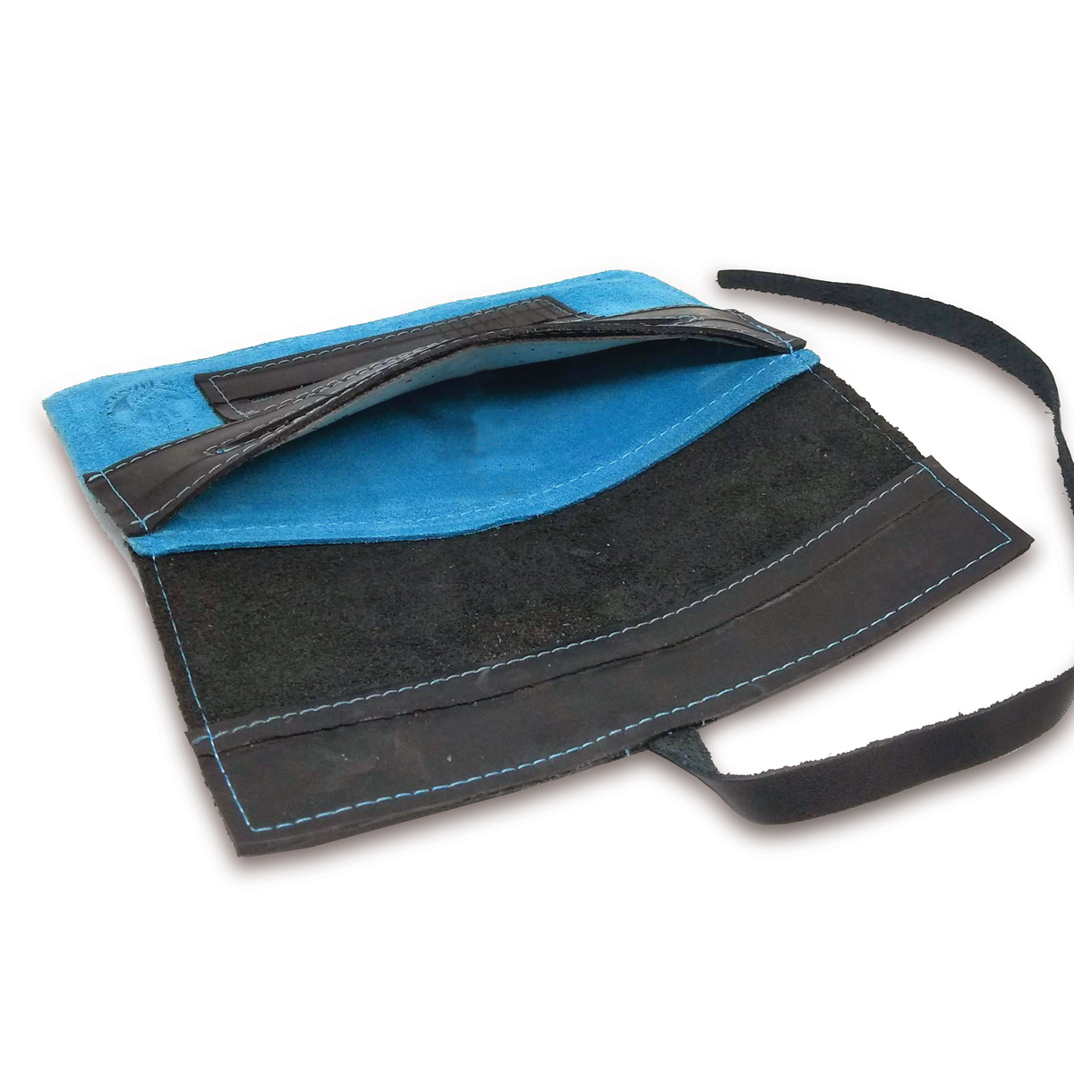 Portatabacco Compatto in Vera Pelle colore nero e azzurro, con taschina portafiltri in tessuto. Realizzato completamente a mano; Made in Italy. Si distingue dal logo impresso sul frontale e dalla chiusura tramite laccetto. La tasca porta cartine è realizzata in pelle mentre la tasca portatabacco, molto ampia, consente di posizionare al suo interno la busta di tabacco aperta e già pronta all’uso. La forma del portatabacco ilMorello Compatto permette di rollare tenendo il portatabacco tra le mani.